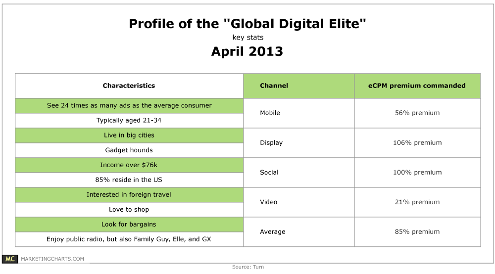 These 2% of global consumers – the “global digital elite” – see 24 times as many ads as the average consumer, and are so prized by marketers that they command 85% higher eCPMs than average.