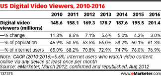 US digital video viewers will make up 56% of the population in 2013 and nearly 73% of internet users. By 2016, there will be 201 million digital video viewers, making up 61% of the population and 77% of all internet users.