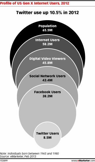 Gen Xers use social networking sites on at least a monthly basis (74.5% did so in 2012), and nearly two-thirds used Facebook in particular (65.6%).